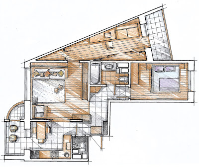 Today we present the apartment that architect Valentin Kuzmin designed for himself. In doing so, she had to take into account the constraints: area - 64,2 m2 total, including two balconies, inconvenient layout, as evidenced by the plan, and a number of construction defects. However, for arranging their own homes any architect is ready to go for risky experiments, even with a small budget, and therefore uses a much larger arsenal of techniques.